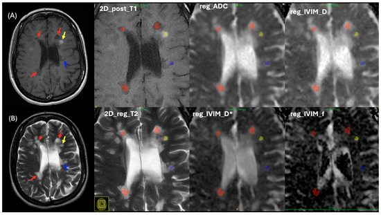 ROIs for three types of MS lesions (enhanced, non-enhanced, and black hole) in a MS patient, delineated on (A) T1WI as a reference image and (B) registered T2WI. From the top left to the right, zoom in on the 2D post-contrast T1WI, registered ADC map, and registered diffusion coefficient (D) map. From down left to right, zoom in registered T2WI, registered pseudo-diffusion coefficient (D*) map, and perfusion fraction (f) map. Red arrows and shape indicate black hole MS lesions, Yellow arrows and shapes indicate enhanced MS lesions, blue arrows and shapes indicated non enhanced MS lesions.