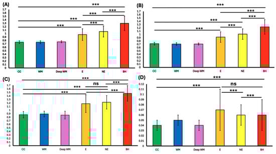 The descriptive statistics for the outcome variables are summarized in Table 2 and Figure 7. For the ADC values, the mean measurements in control regions were as follows: CC (0.75 ± 0.04 mm2/s), white matter (0.75 ± 0.04 mm2/s), and deep white matter (0.73 ± 0.03 mm2/s). Among MS lesions, enhanced lesions exhibited an ADC of 0.97 ± 0.16 mm2/s, non-enhanced lesions had 1.06 ± 0.16 mm2/s, and black holes demonstrated the highest value of 1.29 ± 0.21 mm2/s (p < 0.0001), significantly higher than controls and other MS lesion types.