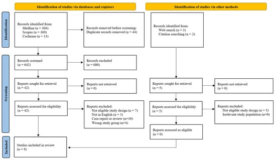 The initial search yielded a total of 686 articles. Following the removal of 44 duplicate entries, the remaining 642 records underwent screening of their titles and abstracts, leading to the exclusion of 600 irrelevant studies. Subsequently, the full text of the remaining 42 studies was thoroughly examined to determine their suitability for inclusion. Furthermore, a review of the reference lists of all pertinent studies, supplemented by an additional online search, identified another five potentially relevant articles. Three studies that might appear to meet the inclusion criteria were excluded from the analysis due to the following reasons: one study reported a composite score for adverse outcomes rather than raw data for every outcome [22], another utilized ex vivo ultrasound on the placenta post-partum [23] and a third assessed placental grading between 37 and 41 weeks of gestation, thus falling outside the defined criteria for PPC [24]. Ultimately, nine cohort studies satisfied the inclusion criteria and were incorporated into this meta-analysis [3,4,5,7,8,9,11,25,26], as visually outlined in Figure 1. Key characteristics of the studies that met the inclusion criteria are detailed in Table 1.