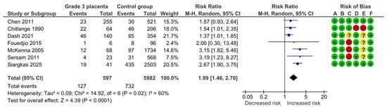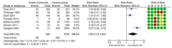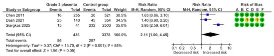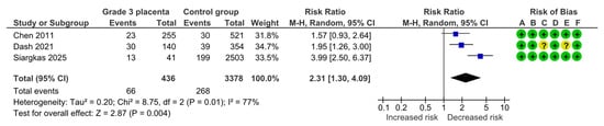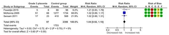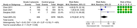 Three studies assessed fetal or neonatal deaths, including 436 pregnancies with grade 3 placentas and 3378 controls. Overall, 10 (2.3%) deaths were detected in the grade 3 group compared with 19 (0.6%) in controls, yielding no statistically significant difference for fetal or neonatal deaths (RR, 2.75; 95% CI, 0.87–8.71; I2 = 40%) (Figure 6).