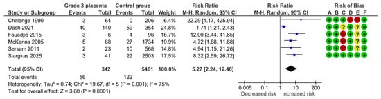 Six studies assessed preeclampsia, including 342 pregnancies with grade 3 placentas and 5461 controls. Overall, 56 (16.4%) cases of preeclampsia were detected in the grade 3 group compared with 122 (2.2%) in controls, yielding a significantly increased risk for preeclampsia (RR, 5.27; 95% CI, 2.24–12.40; I2 = 75%) (Figure 5).