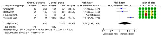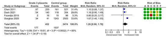 Four studies assessed cesarean section, including 452 pregnancies with grade 3 placentas and 3474 controls. Overall, 177 (39.2%) cases of cesarean delivery were detected in the grade 3 group compared with 1537 (44.2%) in controls, yielding no statistically significant difference for cesarean section (RR, 1.26; 95% CI, 0.90–1.78; I2 = 85%) (Figure 8).