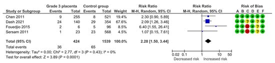 Four studies assessed low 5 min Apgar scores (<7), including 424 pregnancies with grade 3 placentas and 1539 controls. Overall, 36 (8.5%) cases of low 5 min Apgar were detected in the grade 3 group compared with 65 (4.2%) in controls, yielding a significantly increased risk for a low 5 min Apgar score (RR, 2.28; 95% CI, 1.50–3.44; I2 = 0%) (Figure 10).