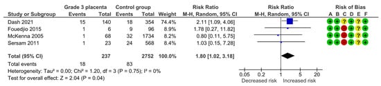 Four studies assessed NICU admission including 237 pregnancies with grade 3 placentas and 2752 controls. Overall, 18 (7.6%) NICU admissions were detected in the grade 3 group compared with 83 (3.0%) in controls, yielding a significantly increased risk for NICU admission (RR, 1.80; 95% CI, 1.02–3.18; I2 = 0%) (Figure 11).