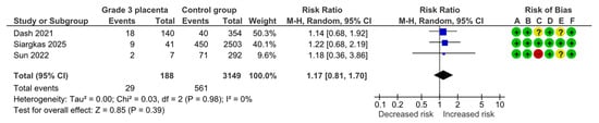 Three studies assessed gestational diabetes mellitus (GDM), including 188 pregnancies with grade 3 placentas and 3149 controls. Overall, 29 (15.4%) cases of GDM were detected in the grade 3 group compared with 561 (17.8%) in controls, yielding no statistically significant difference for GDM (RR, 1.17; 95% CI, 0.81–1.70; I2 = 0%) (Figure 13).