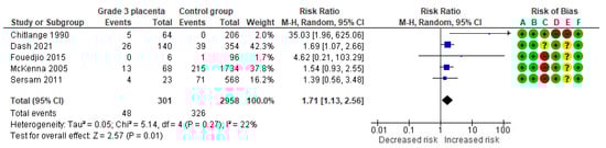 Five studies assessed suspected fetal hypoxia, including 301 pregnancies with grade 3 placentas and 2958 controls. Overall, 48 (15.9%) cases of suspected fetal hypoxia were detected in the grade 3 group compared with 326 (11%) in controls, yielding a significantly increased risk for suspected fetal hypoxia (RR, 1.71; 95% CI, 1.13–2.56; I2 = 22%) (Figure 14).