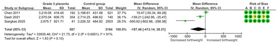 Three studies assessed birthweight, including 587 pregnancies with grade 3 placentas and 3164 controls. Overall, the pooled mean difference was −187.46 g (95% CI, −413.14 to +38.21g; I2 = 91%), indicating no statistically significant difference in birthweight (Figure 15).