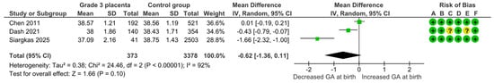 Three studies assessed gestational age at birth, including 373 pregnancies with grade 3 placentas and 3378 controls. Overall, the pooled mean difference was −0.62 weeks (95% CI, −1.36 to +0.11 weeks; I2 = 92%) indicating no statistically significant difference in gestational age at birth (Figure 16).