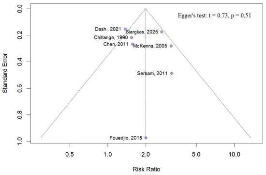 Given the anticipated heterogeneity among observational studies, the DerSimonian and Laird random-effects model was exclusively utilized. Heterogeneity was assessed using Cochran’s Q test (with a significance threshold of p < 0.1) and the I2 statistic, which quantifies the percentage of total variation across studies attributable to heterogeneity rather than chance [19]. Publication bias was evaluated visually through funnel plots and quantitatively using Egger’s test in RStudio [20].
