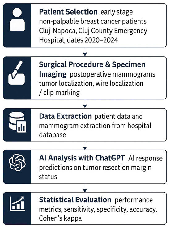 Our database included patients with early-stage breast cancer (non-palpable, clinically occult, but mammographically detectable tumors) treated in Cluj-Napoca, Cluj County Emergency Hospital, between 2020 and 2024. Figure 1 summarizes the overall workflow of the study, from patient selection to final statistical evaluation. Each step in the diagram represents a distinct stage of the methodology: (1) inclusion of eligible patients, (2) surgical excision of the tumor, (3) acquisition of specimen mammograms, (4) de-identification and preparation of imaging data, (5) margin assessment using a standardized ChatGPT prompt, (6) histopathological analysis serving as the reference standard, and (7) statistical comparison between AI predictions and histological findings. While the detailed methodology is described in Section 2.2, Section 2.3 and Section 2.4, this figure offers a concise visual overview of the experimental design and data flow. Neoadjuvant chemotherapy or hormonal therapy was performed in patients with high-risk features.