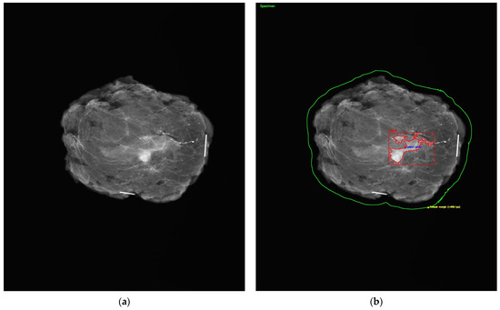 All mammographic images were de-identified prior to AI evaluation. As shown in Figure 2a, each specimen mammogram included radiopaque needle markers to indicate orientation, with the long needle representing the 12 o’clock position and the short needle indicating the 3 o’clock margin. Following input into the model, AI-generated outputs were manually recorded and matched to their corresponding histopathological diagnoses for comparison.