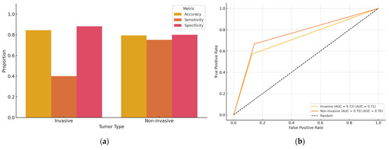 (a) Bar plot illustrating the performance metrics of AI (accuracy, sensitivity, and specificity) of a classification model stratified by tumor invasiveness. The sample included 64 patients with invasive tumors and 29 with non-invasive tumors. (b) ROC curve—invasive vs. non-invasive tumors. This ROC curve illustrates the diagnostic accuracy of the AI model for predicting surgical margin status (R0 vs. R1) stratified by tumor invasiveness. The model achieved an AUC of 0.72 for invasive breast cancers and 0.76 for non-invasive lesions, indicating slightly better margin prediction in non-invasive cases. The diagonal dashed line represents the no-discrimination threshold.