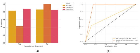 (a) Bar plot illustrating the performance metrics of AI (accuracy, sensitivity, and specificity) of a classification model stratified by the administration of neoadjuvant treatment. The NAT group included 58 patients, and the non-NAT group included 42 patients. (b) ROC curve—with NAT vs. without NAT. This receiver operating characteristic (ROC) curve compares the diagnostic performance of the AI model in predicting surgical margin status (R0 vs. R1) between patients who received neoadjuvant treatment (With NAT) and those who did not (Without NAT). The AI model achieved an AUC of 0.66 in the NAT group and 0.92 in the non-NAT group, suggesting reduced diagnostic accuracy after neoadjuvant therapy. The dashed line represents random chance.