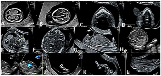 FT ultrasound morphological protocol. (A) Fetal brain (choroid plexus). (B) Fetal brain (thalamus and median septum). (C) Fetal face (upper lip and anterior palate). (D) Fetal face (lower lip and mandible). (E) Face sagittal view. (F) Fetal face (orbits and lens). (G) Fetal thorax and abdomen. (H) Fetal heart (4CV). (I) Fetal heart (3VV in Gray Scale and Color Doppler Mode). (J,K) Fetal limbs (upper and lower limbs). (L) Fetal spine.