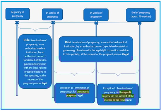 The voluntary termination of pregnancy (VTOP) is based on the patient’s request, without needing the existence of a reason, but within a period established by law. The therapeutic termination of pregnancy (TOP) is an induced abortion following a diagnosis of medical necessity. At the international level, the regulations regarding Sexual and Reproductive Health include, in the category of medical grounds that justify the necessity of terminating the pregnancy, the situations in which the mother’s life is in danger, general health, therapeutic reasons (it should be noted that some regulations refer strictly to physical health), or when there are data regarding the lack of fetal viability or the presence of anomalies [33,34].