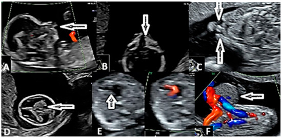 (A) Abnormal fetal profile. (B) Fetal face—cleft palate (arrow). (C) Fetal face—bilateral cleft upper lip (arrows). (D) Abnormal fetal brain. (E) Fetal heart—hypoplastic left heart (arrows; Left side-Grey Scale and Right side-Color Doppler Mode) (F) Fetal abdomen—omphalocele (arrows; Grey Scale and Color Doppler Mode).