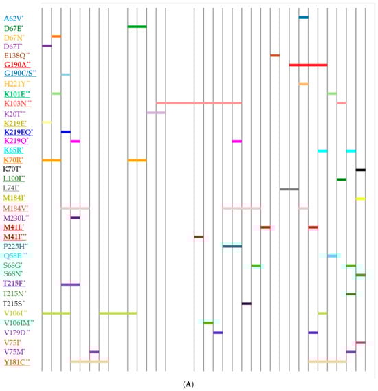 Line charts showing observed patterns of drug resistance mutations for NRTIs. Vertical bars represent DRM profiles. Horizontal marks represent a specific mutation in the profile. Bold underlines indicate major mutations. *: mutations to NRTIs, **: mutations to NNRTIs, ***: mutations to PIs. (A) 2019; (B) 2022.