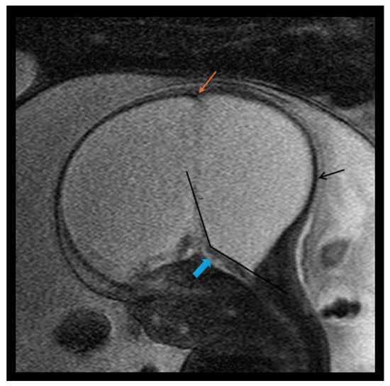 Fetal MRI image of a fetus at 31 gestational weeks with a classical Dandy–Walker cyst and massive hydrocephalus with a possible form of encephaloclastic schizencephaly. The T2-weighted sequence in the sagittal plane depicts a large posterior fossa cyst representing massive enlargement of the 4th ventricle as part of a large classical Dandy–Walker cyst. Pictured is an enlarged intracranial cavity occupied almost completely by CSF, a large posterior fossa cyst with ballooning of the occiput (black arrow), and a thin brainstem (blue arrow) with anterior displacement. There was no evidence of a cerebellum and there was elevation of torcular implantation (orange arrow) and an increased tegmento–vermian angle (black lines). There were enlarged lateral ventricles secondary to the massive hydrocephalus and/or a form of encephaloclastic schizencephaly.