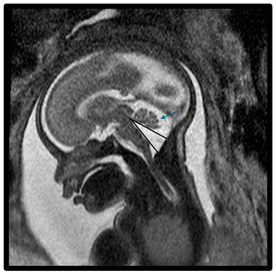 Fetal MRI image of a fetus at 25 gestational weeks with vermian hypoplasia. The midline T2-weighted sagittal image shows an enlarged fourth ventricle, decreased vermian biometry, and enlarged fluid space of the posterior fossa. There was mild hypoplasia of the postero-inferior vermis with slight upward rotation (blue arrow) and increased tegmento–vermian angle (black lines). The fastigial recess was shallow and there was mild widening of the vallecula, the midline outlet of the fourth ventricle. There was a prominent and abnormal fourth ventricle with a loss of the normal diamond shape. The fourth ventricle is shown inferiorly connecting with a prominent cisterna magna through the vallecula.