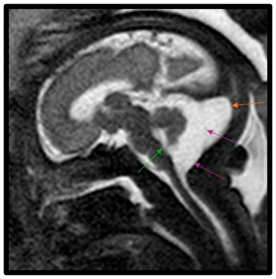 Fetal MRI image of a fetus at 33 gestational weeks with a Blake’s pouch cyst. The T2-weighted sequence in the sagittal plane depicts a slight widening of the midline outlet of the 4th ventricle (green arrow). There is a membrane within the midportion of the CSF space of the cisterna magna with slight bowing of this membrane posteriorly, which is consistent with a Blake’s pouch cyst (purple arrows) involving posterior fossa within this enlarged cisterna magna (orange arrow). The cyst freely communicated with the fourth ventricle with upward displacement of the vermis and elevation of the tentorium.