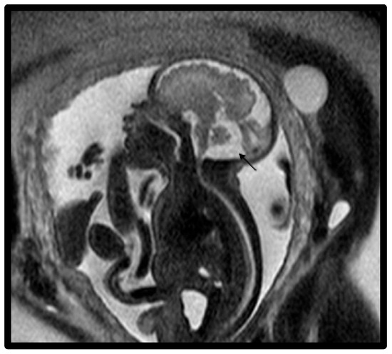 Fetal MRI image of a fetus at 32 gestational weeks with an enlarged cisterna magna. The midline T2-weighted sagittal image shows an enlarged cisterna magna (1.2–1.4 cm) and increased CSF subarachnoid spaces overlying the cerebellum (black arrow). The fourth ventricle did not communicate with the cisterna magna and there was a normally inserted torcula.