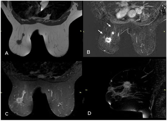 A 38-year-old woman presented with nipple retraction in the left breast. Unenhanced (A) and subtracted (B) MR images revealed 2 masses. The largest had spiculated margins and demonstrated peripheral enhancement, while the second one was well circumscribed and lobulated and demonstrated homogeneous enhancement (white arrows). Axial and sagittal TSE STIR (C,D) images showed no significant edema. Core needle biopsy results of both masses were invasive ductal arcinoma, and ER was 70%, PR was 95%, HER2 was 2 (+) (FISH (−)), and Ki-67 index was 20% for the larger mass. Postoperative pathology revealed 2 metastatic lymph nodes in the axilla.