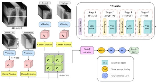 By integrating hierarchical VMamba-based features with attention mechanisms, this architecture effectively captures both local anatomical structures and broader pathological patterns. The combination of feature extraction, attention-based refinement, and fully connected transformations ensures robust severity assessment tailored for complex medical imaging tasks.