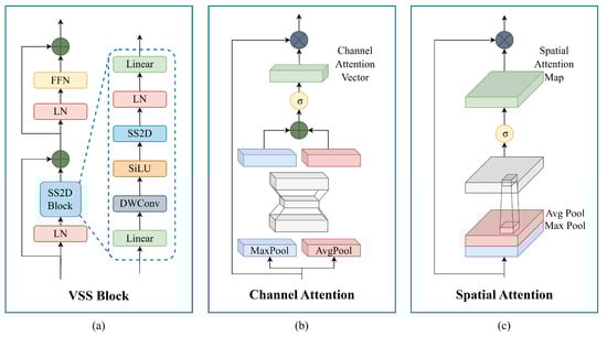 Illustration of the structure of the VSS Block (a), Channel Attention (b), and Spatial Attention (c).
