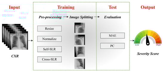 Following augmentation, an image-splitting technique is implemented, dividing each CXR into four quadrants. This enables the model to focus on localized lung regions, improving its ability to detect fine-grained pathological patterns that contribute to severity assessment. The processed images are then fed into the proposed deep learning model, which predicts a continuous severity score indicative of disease progression. The final output provides a quantitative severity score, aiding clinicians in evaluating disease progression and supporting informed medical decision-making. Figure 4 visually outlines the entire workflow, illustrating the sequential steps of our proposed work.