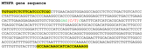 For the genetic variant analysis, Restriction Fragment Length Polymorphism (RFLP) was applied [45]: a 513 bp (base pair) fragment of the MTHFR gene, containing the 677C>T variant site, was amplified by polymerase chain reaction (PCR). PCR was carried out using KAPA HiFi polymerase (Kapa Biosystems, Cape Town, South Africa) and the following primers: forward 5′-TGTGGTCTCTTCATCCCTCGC-3′ and reverse 5′-CCTTTTGGTGATGCTTGTTGGC-3′ (Figure 1).