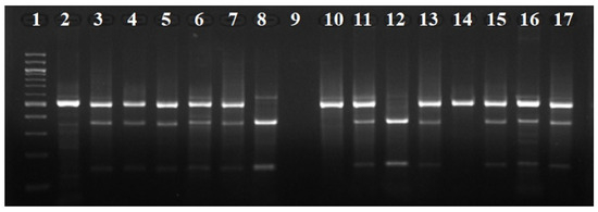 Cycling conditions included an initial denaturation step at 95 °C for 3 min, followed by 35 cycles of denaturation at 98 °C for 20 s, annealing at 63 °C for 15 s and extension at 72 °C for 15 s. The PCR products were then digested with restriction endonuclease Hinf I (Cat #R0155, New England Biolabs, Ipswich, MA, USA). The reaction mixture was incubated at 37 °C for 30 min, followed by incubation at 80 °C for 20 min, to inactivate the enzyme. The digestion products were electrophoresed on a 1.5% agarose gel and DNA fragments were visualized on a UV light bank, using ethidium bromide staining (Figure 2).
