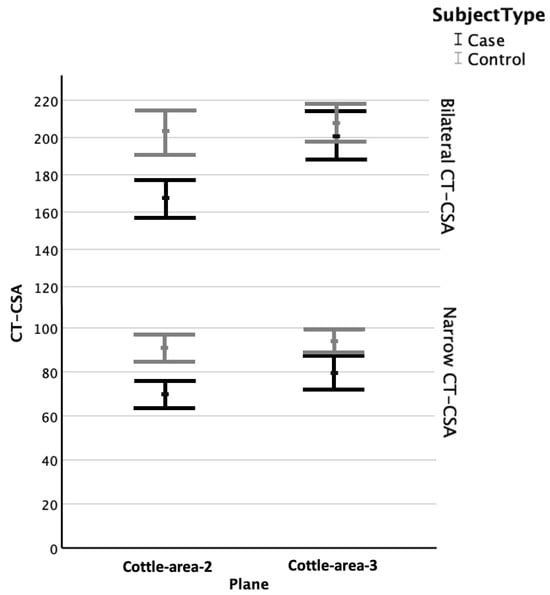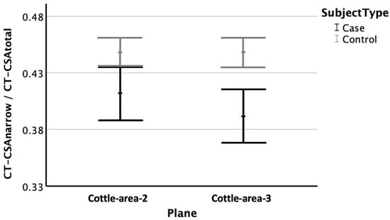 CT-CSACOT-2-ratio were significantly smaller in the cases (median: 44%; lower quartiles 39% to upper quartiles 47%) than they were in the controls (46%; 42% to 49%; Mann–Whitney U test; p = 0.015; Figure 3). Similarly, CT-CSACOT-3-ratio were significantly smaller in the cases (41%; 33% to 47%) than they were in the controls (47%; 42% to 48%; Mann–Whitney U test; p < 0.001; Figure 3).