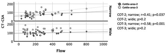 Correlation of CT-CSA in the planes of Cottle-area-2 and Cottle-area-3 with flow of active anterior rhinomanometry. Y-Axis: CT-CSA in mm2. X-Axis: Flow in mL/s. Dark grey and light grey circles, as well as dark grey and light grey lines indicate the Cottle-area-2 (COT-2) and Cottle-area-3 (COT-3), respectively. The upper and lower diagram indicate the narrow and wide nasal side, respectively. Note the significant correlation (r = 0.58) between the CT-CSA of Cottle-area-3 and flow on the narrow nasal sides (p = 0.001) but not on the wide nasal sides (p > 0.2).