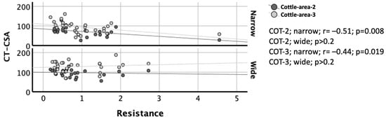 Correlation of CT-CSA in the planes of Cottle-area-2 and Cottle-area-3 with resistance of active anterior rhinomanometry. Y-Axis: CT-CSA in mm2. X-Axis: Resistance in sPa/mL. Dark grey and light grey circles, as well as dark grey and light grey lines indicate the Cottle-area-2 (COT-2) and Cottle-area-3 (COT-3), respectively. The upper and lower diagram indicate the narrow and wide nasal side, respectively. Note the significant negative correlation (r = −0.56) between the CT-CSA of Cottle-area-2 and resistance on the narrow nasal sides (p = 0.008) but not on the wide nasal sides (p > 0.2).