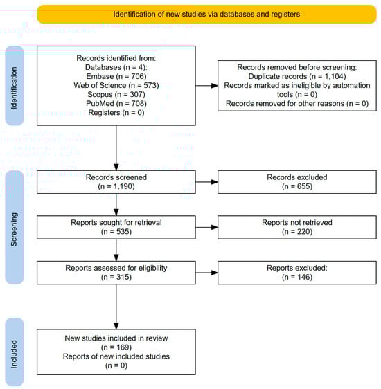 A systematic literature search was conducted according to the Preferred Reporting Items for Systematic Review and Meta-Analysis Protocols Extension for Scoping Reviews (PRISMA-ScR) guidelines [36,37]. The PRISMA-ScR checklist is available in the Supplementary Materials. The primary aim was to identify studies that report predictive factors for GI and/or GU toxicities in PCa patients treated by CFRT, MHRT, or UHRT. The secondary aim was to report on the relevant machine learning (ML) or artificial neural network (ANN)-based predictive models. Searches were conducted on Embase, Web of Science, Scopus, and PubMed databases on 31 December 2024. The search strategy for each database is listed in Table A1. The flow diagram for the selection of sources of evidence is displayed in Figure 1.