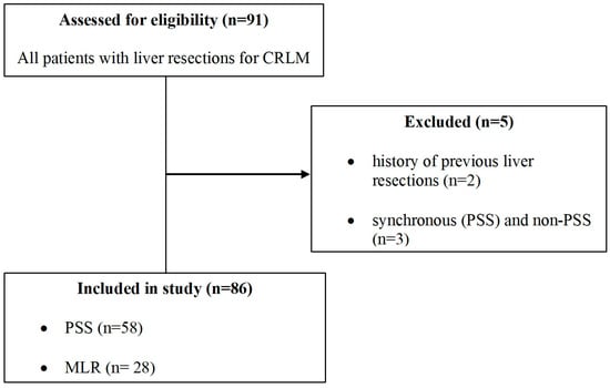 The inclusion criteria consisted of patients with CRLM undergoing a first liver resection without extra-hepatic disease. Exclusion criteria included patients with a history of previous liver resections and those with multiple metastases requiring both parenchymal-sparing surgery and major liver resection. (Figure 1).