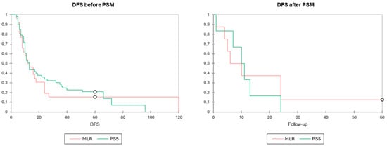 With a mean follow-up of 33 months, patients who underwent PSS had a mean OS of 31.0 (3–110) months compared to 37.1 (3–123) months for those who underwent MLR (p = 0.341). Similarly, the mean DFS was 25.2 (4–96) months for the PSS group versus 22.2 (4–120) months for the MLR group (p = 0.605). (Table 3). In a univariate Cox proportional hazards model, PSS was not found to be a risk factor for death (OS) or recurrence (DFS), with a hazard ratio of 1.133 [95% CI 0.565–2.273, p = 0.724] and 0.897 [95% CI 0.537–1.497, p = 0.677], respectively. After, PSM results remained similar both for DFS and OS. Kaplan–Meier curves (Figure 2 and Figure 3) depict the survival distribution between the two groups showing similar OS and DFS survival.