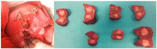 The concept of PPS was pioneered in the 1980s by Makuuchi and colleagues, as a safer alternative to high-risk major resections []. Initially, PSS was often equated with limited resections for small, superficial CRLM—commonly known as “cherry-picking surgery”—or minor anatomic resections for deep-seated tumors (Figure 4). However, the advent of intraoperative ultrasound has transformed PPS by allowing surgeons to precisely navigate deep-seated tumors through multiplanar dissection. Intraoperative ultrasound enhances the ability to safely separate tumors from major intrahepatic vessels, provided there is no sign of vascular infiltration. Moreover, it enables visualization of communicating vessels between major hepatic veins, optimizing surgical planning. These advancements have paved the way for complex PPS techniques, including sophisticated core hepatectomies, thereby broadening the scope of parenchyma-sparing approaches in the management of CRLM [,,]. In our study, all patients underwent intraoperative ultrasound-guided resections, ensuring precise navigation for deep metastases near major vessels, with complex resections consistently performed under IOUS guidance (Figure 5).