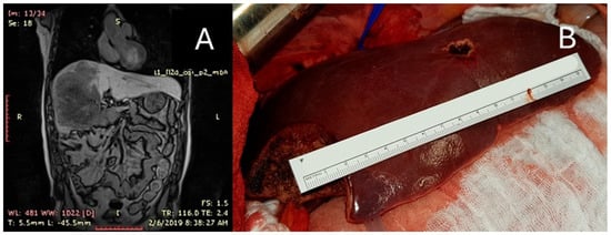 PSS as an extensive hepatic resection for CRLMs: Patient with right trisectionectomy for voluminous metastasis of rectosigmoid cancer; hepatic volumetry—tumor volume 2592 cm3, specimen volume 3030 cm3; resected non-tumor parenchyma volume only 14.6% of the specimen. For this patient, a small liver metastasis of 13 cm3 from segment III was also resected as PSS. (A) Preoperative MRI shows a large tumor occupying the entire right liver and almost completely segment IV. (B) Intraoperative image of remnant liver (segments II and III with PSS resection of segment III 13 cm3 metastasis) representing 62% of total non-tumor liver.