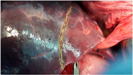 PSS may be particularly advantageous for patients undergoing systemic therapy prior to surgery, as neoadjuvant chemotherapy—especially oxaliplatin-based regimens—has been associated with sinusoidal obstruction syndrome (SOS), a chemotherapy-induced hepatic injury []. SOS has been linked to an increased risk of postoperative complications, such as bleeding, liver abscesses, and liver failure []. In our study, 69 out of 86 patients (80.2%) received neoadjuvant chemotherapy including oxaliplatin, with 44 patients (75.8%) in the PSS group and 25 patients (89.2%) in the MLR group (p = 0.246). Notably, in one patient in the MLR group who developed post-hepatectomy liver failure (PHLF) syndrome, the intraoperative evaluation revealed a characteristic post-chemotherapy “blue-liver” appearance (Figure 7).
