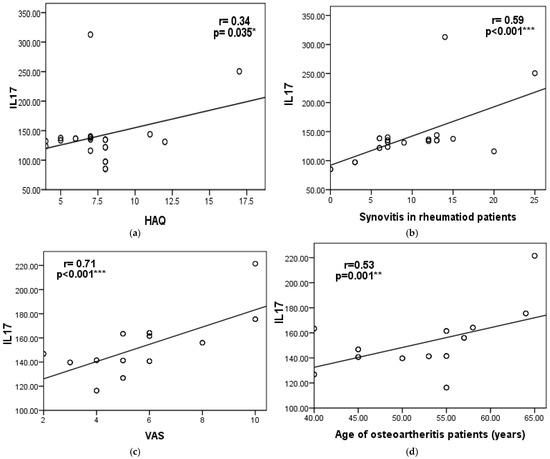 Scatter diagram showing the correlation between serum IL-17 levels and (a) Health Assessment Questionnaire (HAQ) and (b) synovitis in the RA group, and (c) the visual analog scale (VAS) (d) and age of osteoarthritis patients. Significant differences were defined as *** p < 0.001, ** p < 0.01, and * p < 0.05.