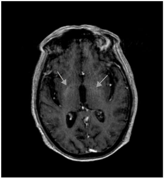 An evaluation of the parenteral nutrition formula showed the Mn content to be 300 µg of Mn·day−1, nominal for 31 days. In 2012, the ASPEN revised its recommended manganese dose from 60–100 µg·d−1 to a lower dose of 55 µg·day−1, a recommendation increasingly supported by experts [28,29]. Considering these recommendations, the patient’s manganese intake appeared to be elevated and potentially toxic. Despite the fact that the exposure period lasted for only 31 days, this excessive exposure likely contributed to manganese accumulation, as evidenced by the MRI findings and the subsequent development of chorea. The presence of liver dysfunction, which may have impaired manganese clearance, further supported the likelihood of manganese toxicity as the underlying cause of the patient’s neurological symptoms. This diagnosis was confirmed by the quantification of manganese levels using graphite furnace atomic absorption spectrophotometry. Mn determination in whole blood by GFAAS provided a total of 34 µg·L−1, higher than the normal upper limit (13 µg·L−1).