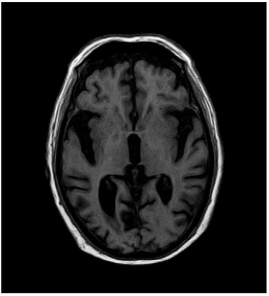 A paraneoplastic origin of the movement was dismissed, basal ganglia metastasis was ruled out, and no metabolic disorders (different from the previous diabetes mellitus) were found that could justify the choreiform movements. No ischemic or demyelinating lesions were observed. The only significant finding was observed in the MRI, which revealed T1 hyperintensity in the basal ganglia, a finding suggestive of metal deposition. The Mn (II) ion has five unpaired electrons in the 3d orbit, causing the shortening of the T1 relaxation time and an increase in the signal intensity in T1-weighted MRI. Signs of supra- and infratentorial atrophy were observed with the enlargement of sulci, cisterns, and the ventricular system, correlating with age.