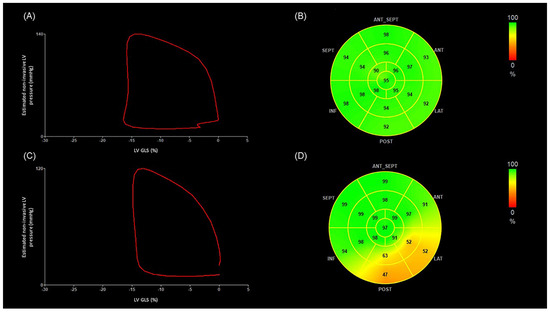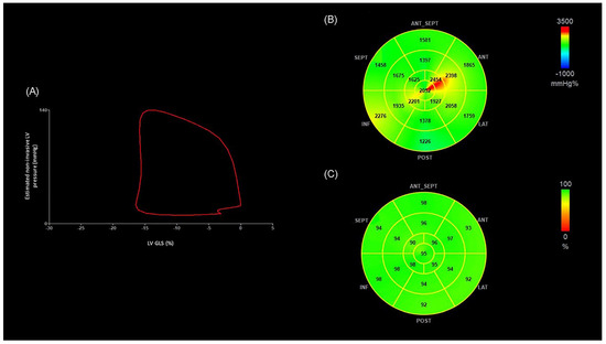 MW indices were calculated by the same vendor-specific module (EchoPAC version 202; GE Healthcare, Milwaukee, WI, USA) combining the previously obtained LV strain data and a noninvasively estimated LV-pressure curve. Blood pressure (BP) was measured immediately before TTE, with peak systolic LV pressure assumed to be equal to peak arterial pressure. A non-invasive LV pressure curve was then constructed by the software according to the duration of isovolumic and ejection phases defined by the timing of aortic and mitral valve opening and closing events on 2D echocardiography. This estimated LV pressure curve was combined with strain to produce a LV pressure–strain loop (Figure 1), from which the software automatically calculated the following MW parameters [17]: