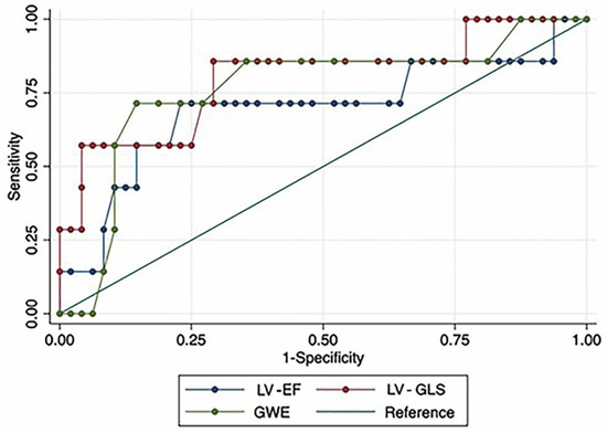 Receiver operating characteristic (ROC) curves for LV-EF, LV-GLS, and GWE. LV-EF: left ventricular ejection fraction; LV-GLS: global longitudinal strain of left ventricle; GWE: global work efficiency.