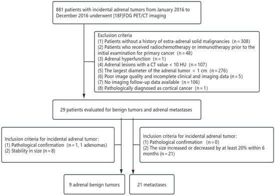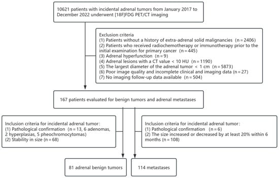 This study is a retrospective analysis. The data utilized, including medical records and imaging materials, have undergone complete de-identification to ensure that patient identities cannot be traced. Furthermore, this study involves only the analysis of existing data and does not entail any interventions or additional examinations on the subjects. In accordance with the relevant provisions of China’s “Ethical Review Measures for Biomedical Research Involving Human Beings”, this retrospective study conducted by our institution meets the criteria for ethical exemption and therefore does not require an Institutional Ethics Committee. Written informed consent was obtained from each patient to publish this paper. From January 2017 to December 2022, a total of 167 patients (74 in the benign tumor group and 93 in the metastases group) who underwent [18F]FDG PET/CT imaging at Peking University Cancer Hospital for the evaluation of extrarenal solid tumors were included in this study. Clinical and routine PET/CT parametric models, radiomics models, and nomograms were constructed based on this cohort. For external validation, an additional 30 patients meeting the same inclusion and exclusion criteria (10 in the primary tumor group and 20 in the metastatic tumor group) were recruited from the same center between January 2016 and December 2016. The inclusion criteria for benign tumors were (1) the largest diameter of the adrenal tumor > 1 cm; (2) confirmation by puncture pathology or surgical pathology; and (3) during cancer treatment, no significant change in the size of adrenal lesions over at least a 1-year interval []. The inclusion criteria for metastases group were (1) the largest diameter of the adrenal tumor > 1 cm; (2) confirmation by puncture pathology or surgical pathology; and (3) during cancer treatment, the volume of adrenal nodules in the same patient increased or decreased by at least 20% within 6 months []. Exclusion criteria included (1) patients without a history of extra-adrenal solid malignancies; (2) patients who received radiochemotherapy or immunotherapy prior to the initial examination for primary cancer; (3) adrenal hyperfunction; (4) adrenal lesions with a CT value < 10 HU; (5) poor image quality, making tumor boundaries difficult to identify; (6) incomplete clinical and imaging data. The exclusion criteria for the included cases are summarized in Figure 1 and Figure 2.