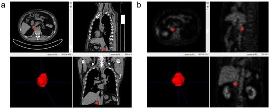 A nuclear medicine physician with three years of work experience imported PET images, whole-body low-dose CT images and high-resolution CT images into ITK-SNAP software (version 3.8.0; https://www.itksnap.org) respectively and manually delineated the region of interest (ROI) encompassing adrenal tumors on a layer-by-layer basis in the axial plane. In cases of disagreement between the initial physician and a senior reviewer, a third senior nuclear medicine physician provided assistance to reach a consensus. All segmented results, saved in NIfTI format, were prepared for subsequent image feature extraction and analysis. The segmented lesions are illustrated in Figure 3.