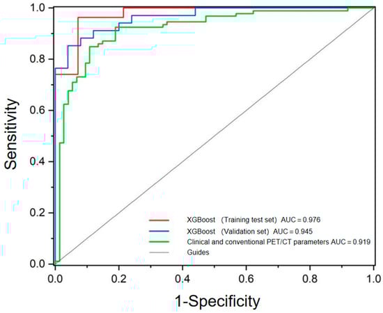 The results demonstrated that XGBoost had the highest overall accuracy in both the training (0.883) and validation sets (0.932), along with excellent sensitivity (0.930), specificity (0.960), PPV (0.970), and NPV (0.890). LightGBM and AdaBoost also exhibited strong performance, achieving validation accuracies of 0.915, with LightGBM showing particularly high specificity (0.960) and PPV (0.970). In contrast, Decision Tree and KNN models underperformed, with validation accuracies of only 0.797 and 0.831, respectively. Notably, GaussianNB achieved the highest specificity (0.960) and PPV (0.970), albeit with moderate sensitivity (0.850), suggesting its potential utility in scenarios where minimizing false positives is critical. Conversely, GDBT and LR exhibited high sensitivity (0.940) but relatively lower specificity, making them suitable for applications prioritizing the detection of true positives. These findings highlight XGBoost as the most robust and generalizable model, with AUC values of 0.976 and 0.945 for the training test set and validation set, respectively. Moreover, it demonstrated superior performance compared to the model constructed by clinical and conventional PET/CT parameters. The ROCs of these two models are shown in Figure 4. However, the Delong test revealed no statistically significant differences among the three AUCs (all p > 0.05).