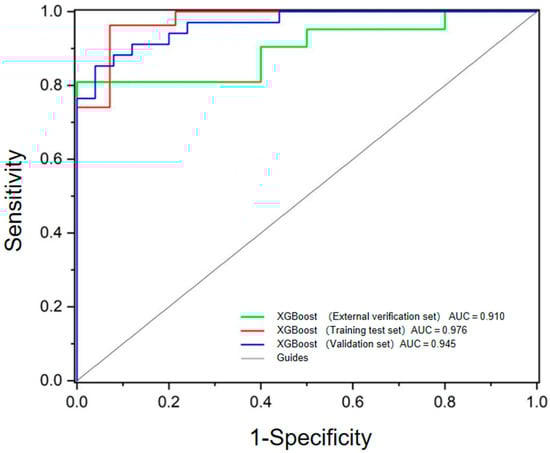 ROC analysis of XGBoost model for the training test set, validation set, and external validation set.