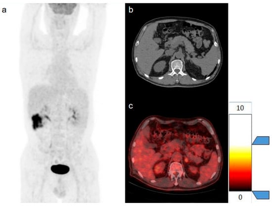 Patient No. 6 (a) The maximum density projection (MIP), (b) the high-resolution CT, and (c) the PET/CT.